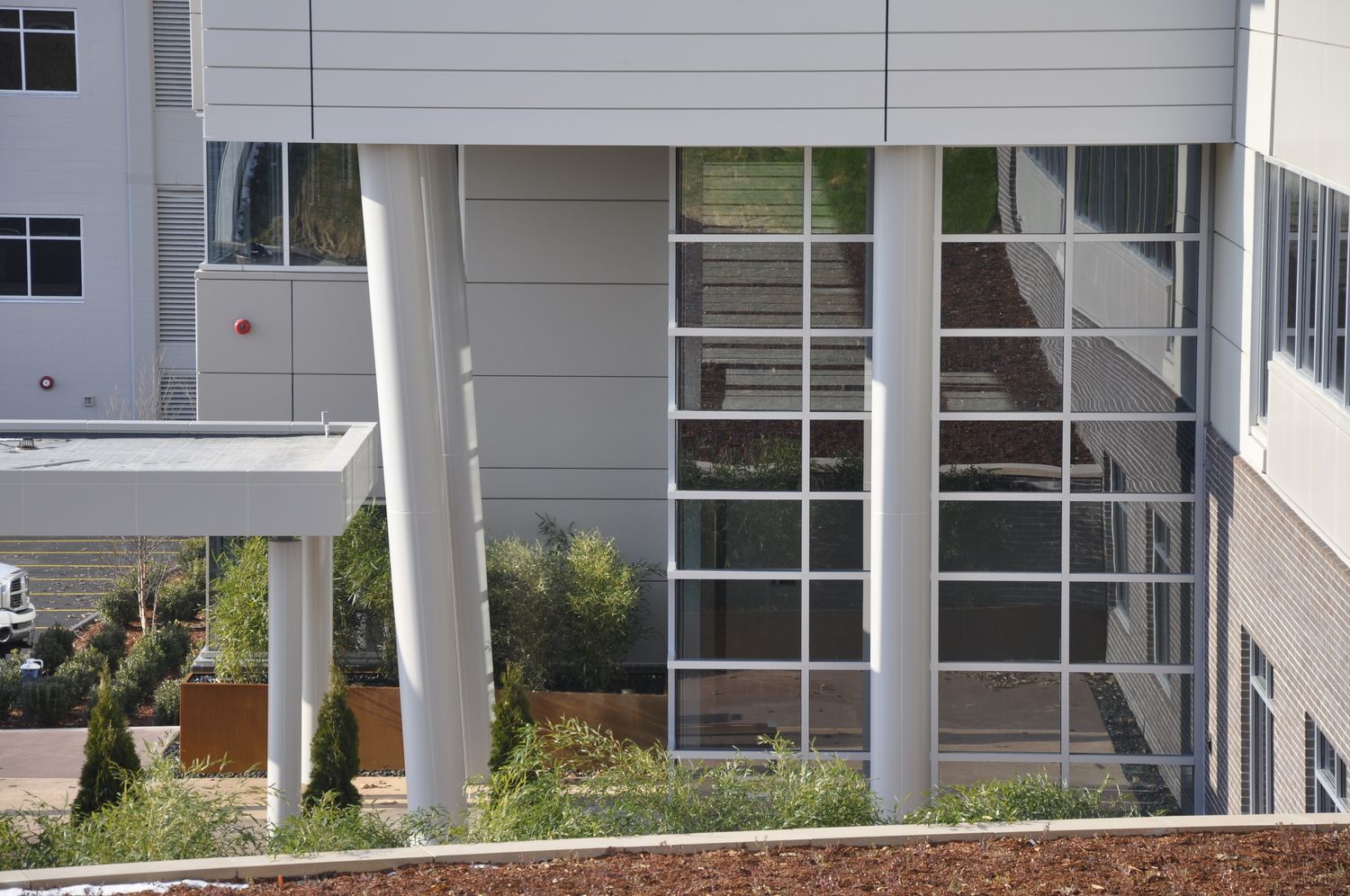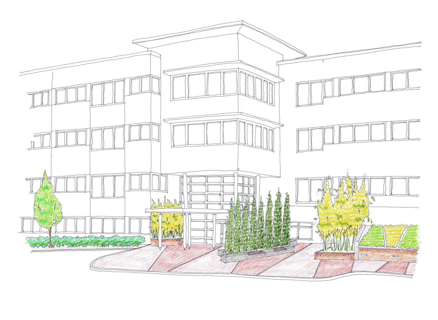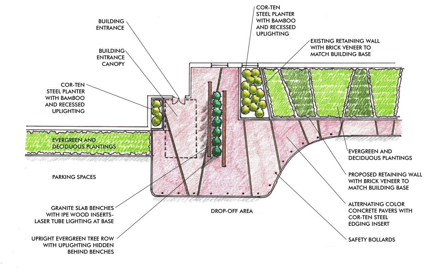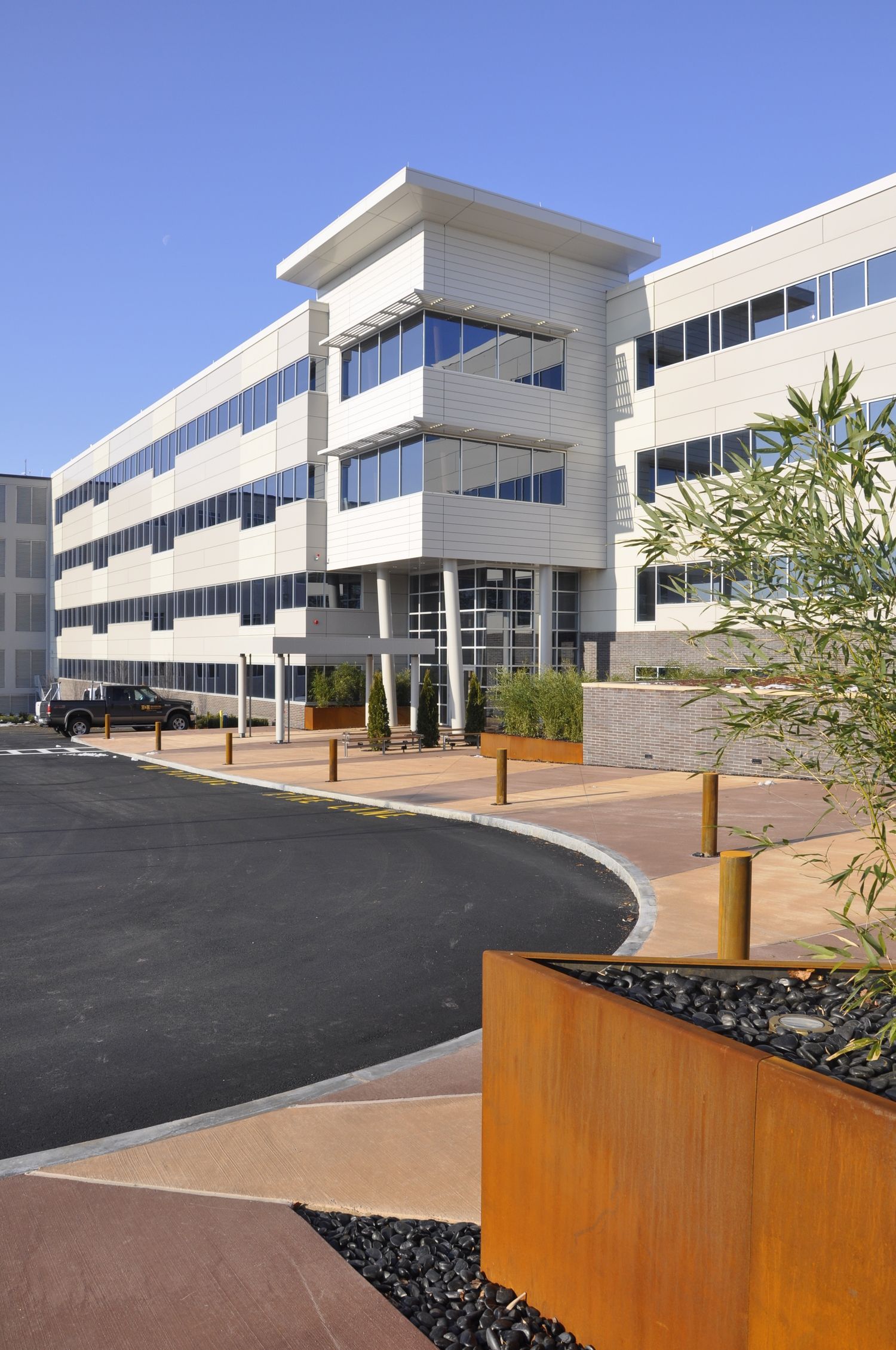 The design of the entrance landscape became an exercise in contrast- form, color, texture, and finish. All of the landscape elements were compositionally balanced to create an environment that alternately blended with and stood out from the new building skin and form. The rough, muted texture of the wedge-shaped, custom designed cor-ten steel planters was contrasted by the smooth, shiny texture of black polished river rock and the fine, delicate texture of Phyllostachys bissetti (David Bissett bamboo). The pavement was designed as a series of alternate-colored wedges that contrasted with the smooth, elegant orthogonal geometry and simple white and glass finish of the new building façade. The wedge shapes of the pavement were continued into a retained planting area, where alternate fields of Ajuga reptans ‘Mahogany’ (Mahogany Bugleweed) and Arctostaphylos uva-ursi (Bearberry) create additional color and textural contrast.