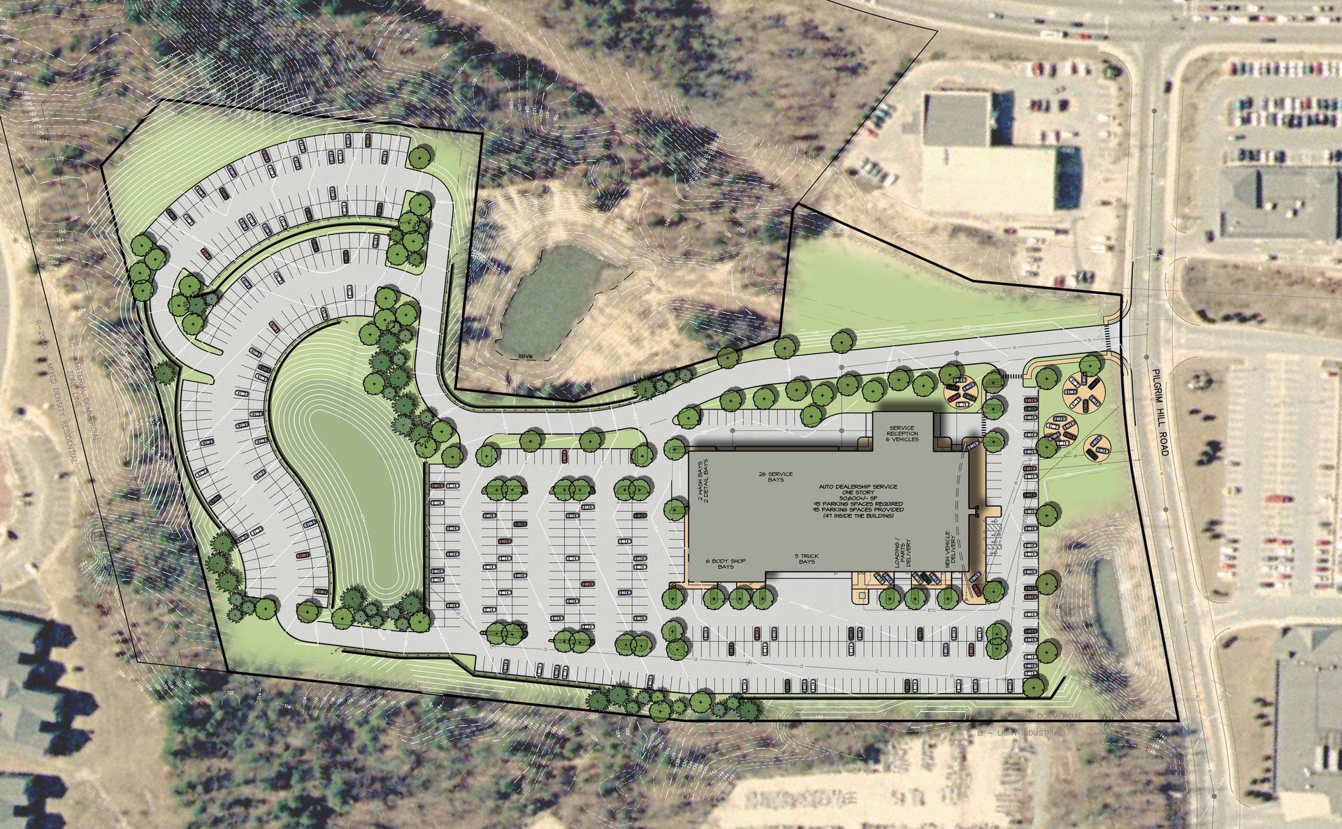 Construction is underway on the new 50,000 square foot Colonial Ford dealership on Pilgrim Hill Road in Plymouth, Massachusetts. This challenging 14 acre site contained dramatic elevation changes and numerous existing drainage easements created to handle storm-water runoff from abutting properties. Although there was significant topographic relief, the site was designed to balance earthworks. Tiered vehicle storage areas were designed into the slopes that will accommodate 750 vehicles when completed. The building features a service reception area for six vehicles, a new car delivery area, forty car and truck bays and a body shop. Vehicle and pedestrian circulation throughout the site were design to minimize conflicts. Vehicle display pods are located at the front of the site to maximize visibility from the busy Samoset Street intersection. Storm-water will be channeled to a large infiltration basin located at the site’s natural low point located at center of the site. Native street trees will line the access drive and shade trees with under-story ornamental grasses and perennials will be planted in the landscape islands.