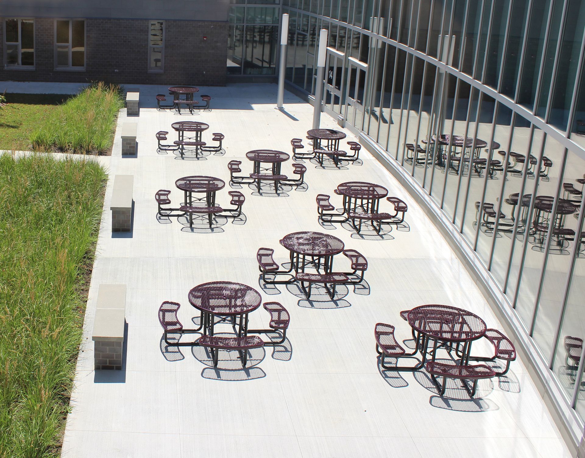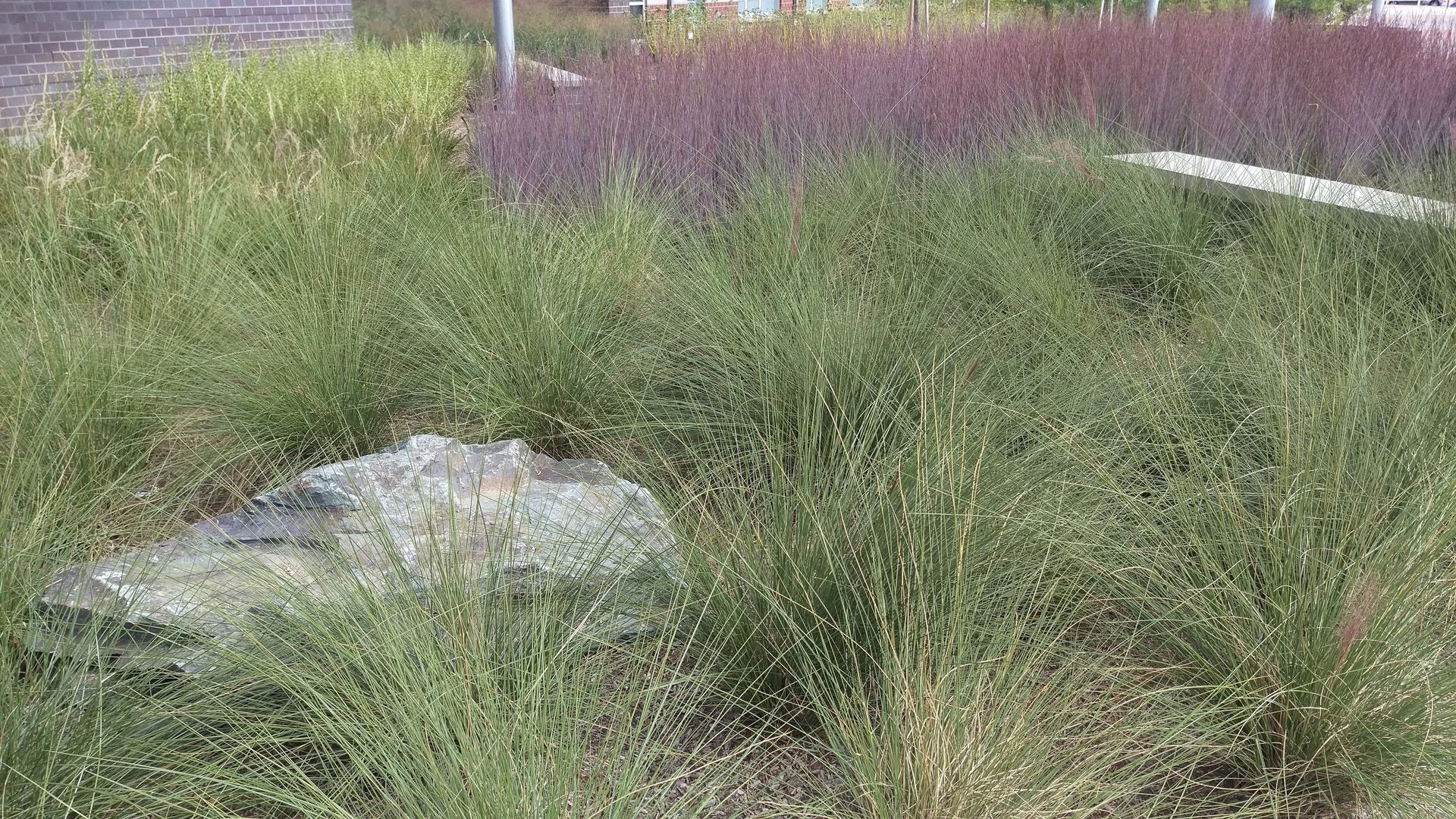The building entrance area is developed as a sustainable landscape, capturing and mitigating stormwater in separate planting areas of alternating bands of native grasses and perennials. A series of small seat walls interspersed within the plantings and along the edge of the pedestrian zone add scale to the landscape while providing seating for waiting students.